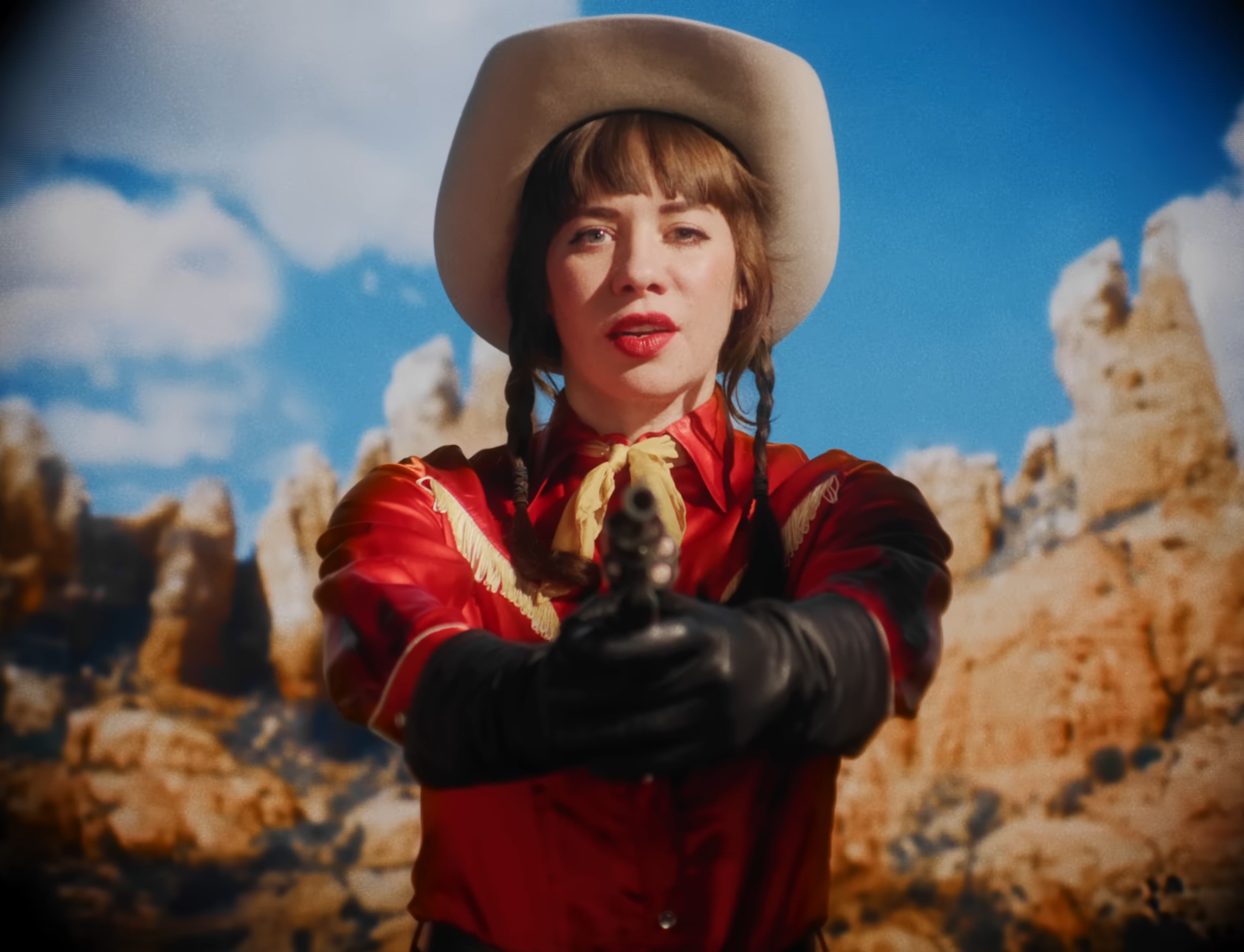 You’re looking down the barrel of a fully loaded revolver held by a striking, red-and-yellow clad cowgirl staring straight into your soul.